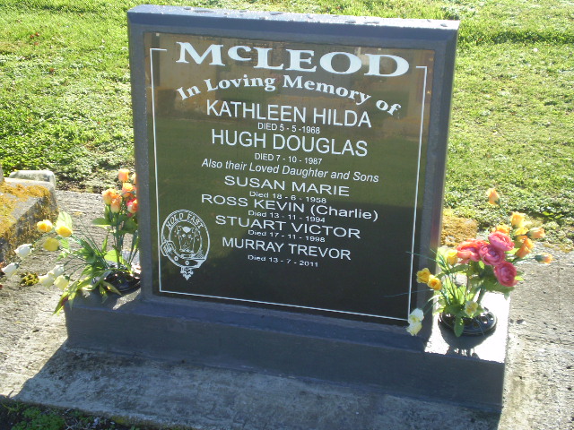| Inscription: | McLEOD - In loving memory of KATHLEEN HILDA, died 5 May 1968; HUGH DOUGLAS, died 7 October 1987; also their loved daughter and Sons, SUSAN MARIE, died 18 June 1958, ROSS KEVIN (Charlie) died 13.11.1994, STUART VICTOR died 17.11.1998, MURRAY TREVOR, died 13.7.2011. |