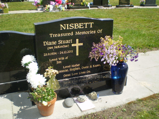 | Inscription: | NISBETT: Treasured Memories of DIANE STUART (nee McKerchar) 25.9.1934 - 24.12.2011. Loved wife of Jim. Loved Mother of Rosanne, Stephen, Owen & Karen. Great love lives on. |