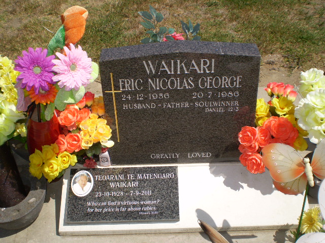 | Inscription: | WAIKARI: ERIC NICOLAS GEORGE 24.12.1956 - 20.7.1986, Husband, Father, Soulwinner Daniel 12:3. Greatly loved.