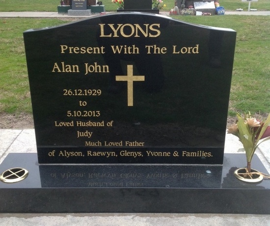 26.12.1929 to 5.10.2013. Loved husband of Judy. Much loved father of Alyson, Raewyn, Glenys, Yvonne & Families. |