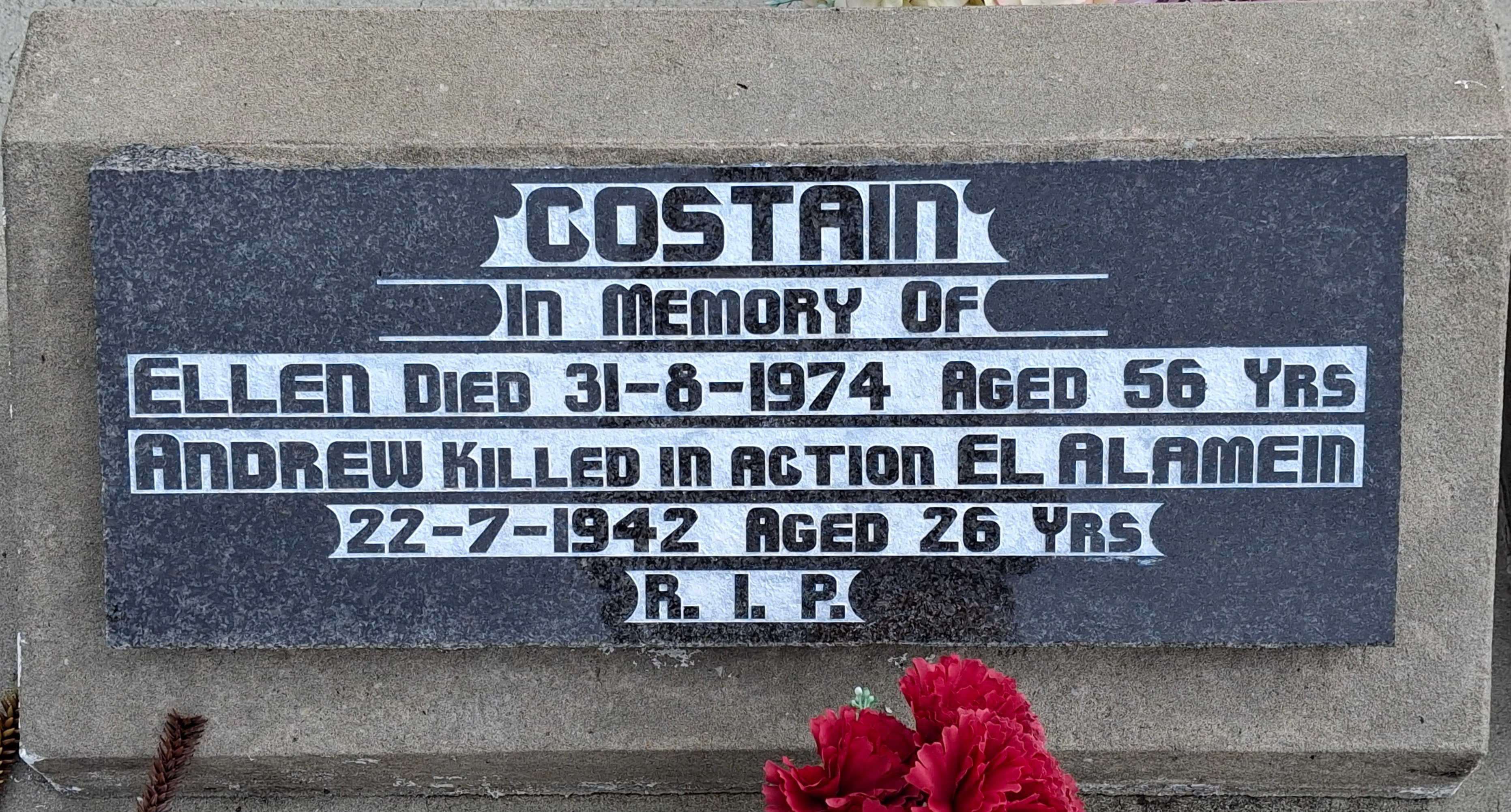 | Inscription: | McGACHIE - In loving memory of PHILIP, died 30 August 1943 aged 58; ELLEN, died 23 March 1958, 71 years. R.I.P. COSTAIN - In loving memory of ELLEN, died 31 August 1974, aged 56 years; ANDREW, killed in action El Alamein, 22 July 1942 aged 26 years. R.I.P. McGACHIE - In loving memory of 5911 A.B.S., R.N.Z.N., DANIEL J A, died 25 October 1975 aged 50 years. R.I.P. |